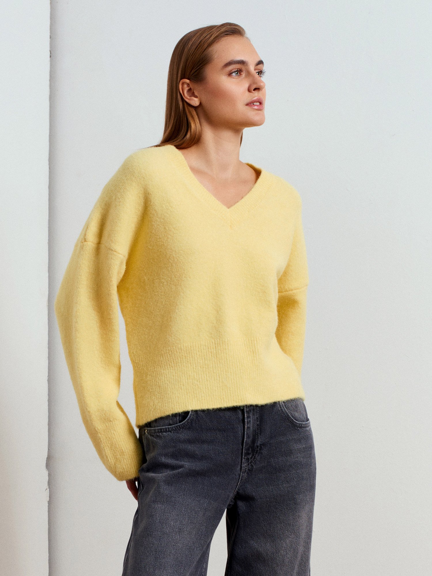 V Yaka Yün Karışımlı Triko Kazak-Koyu Sarı