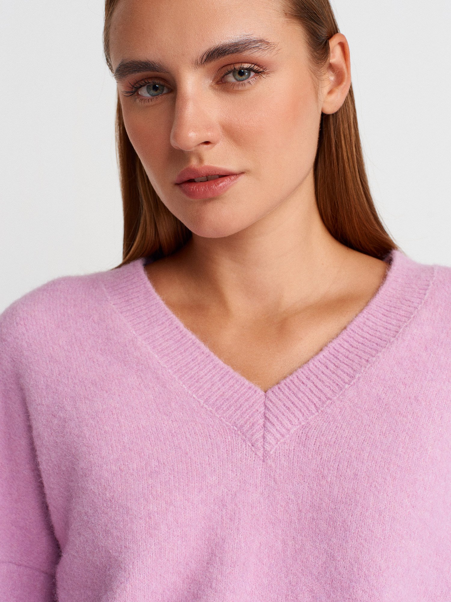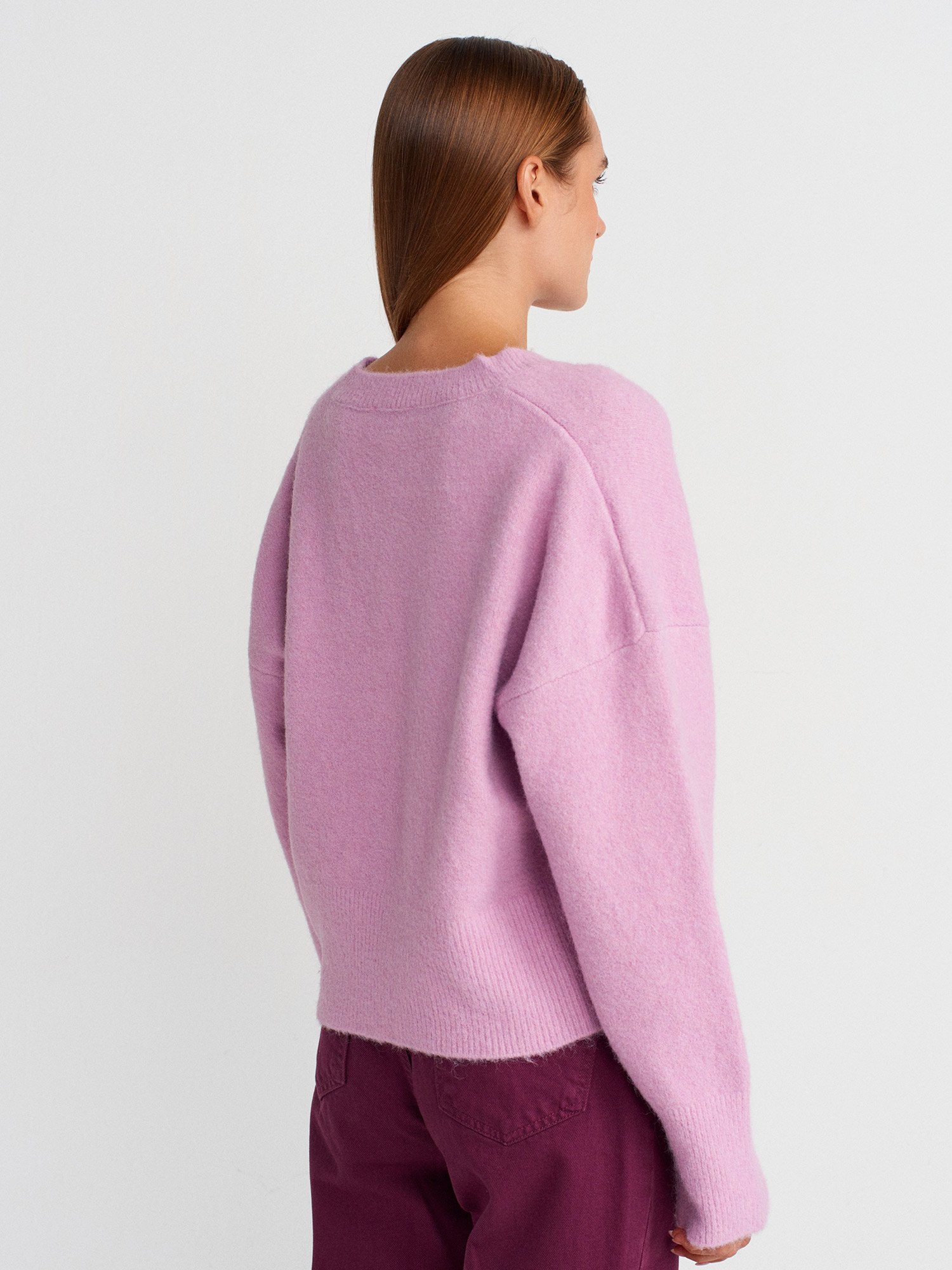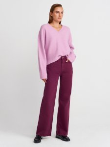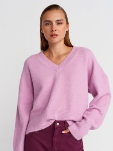 V Yaka Yün Karışımlı Triko Kazak-Lavanta