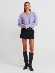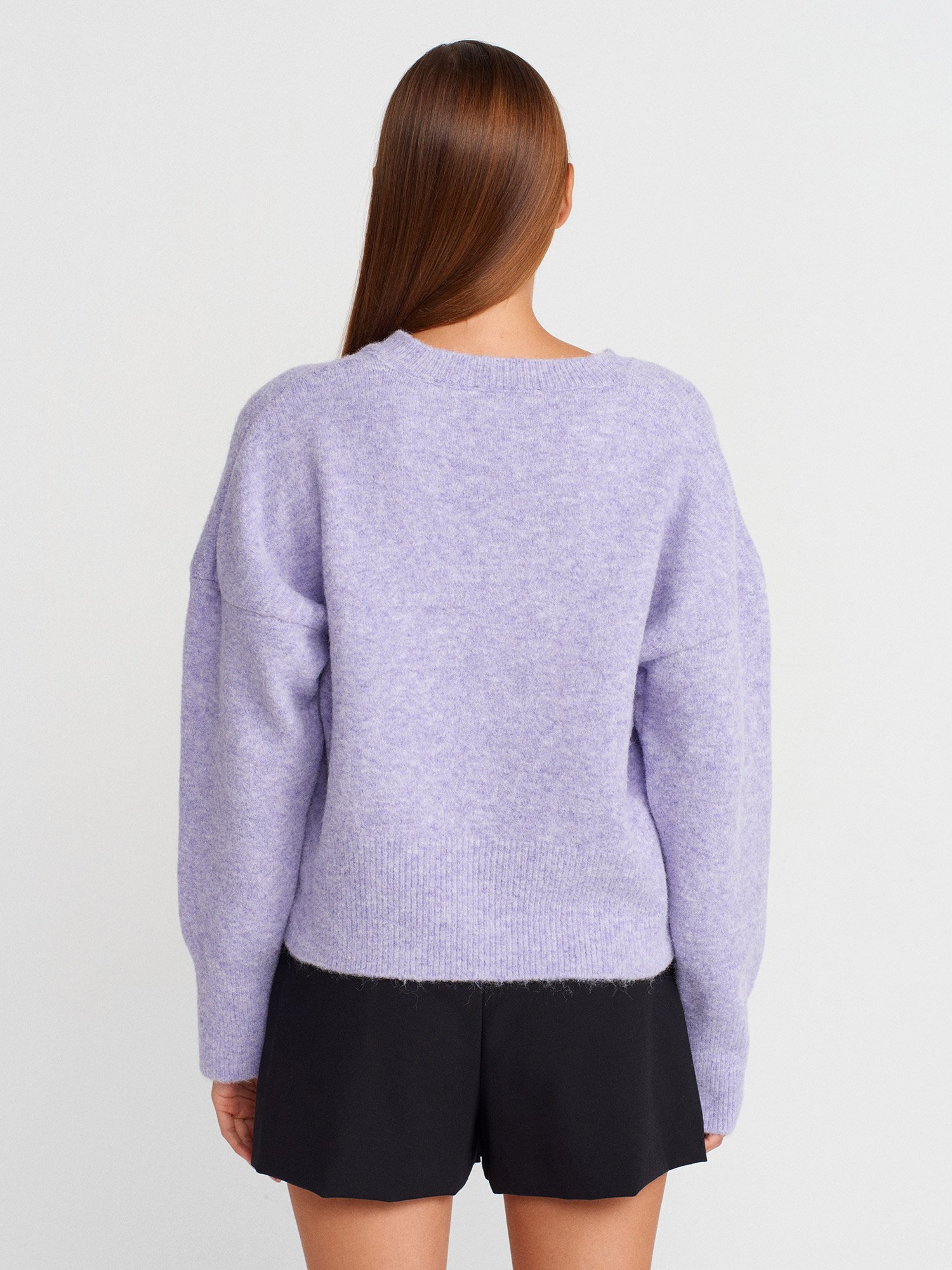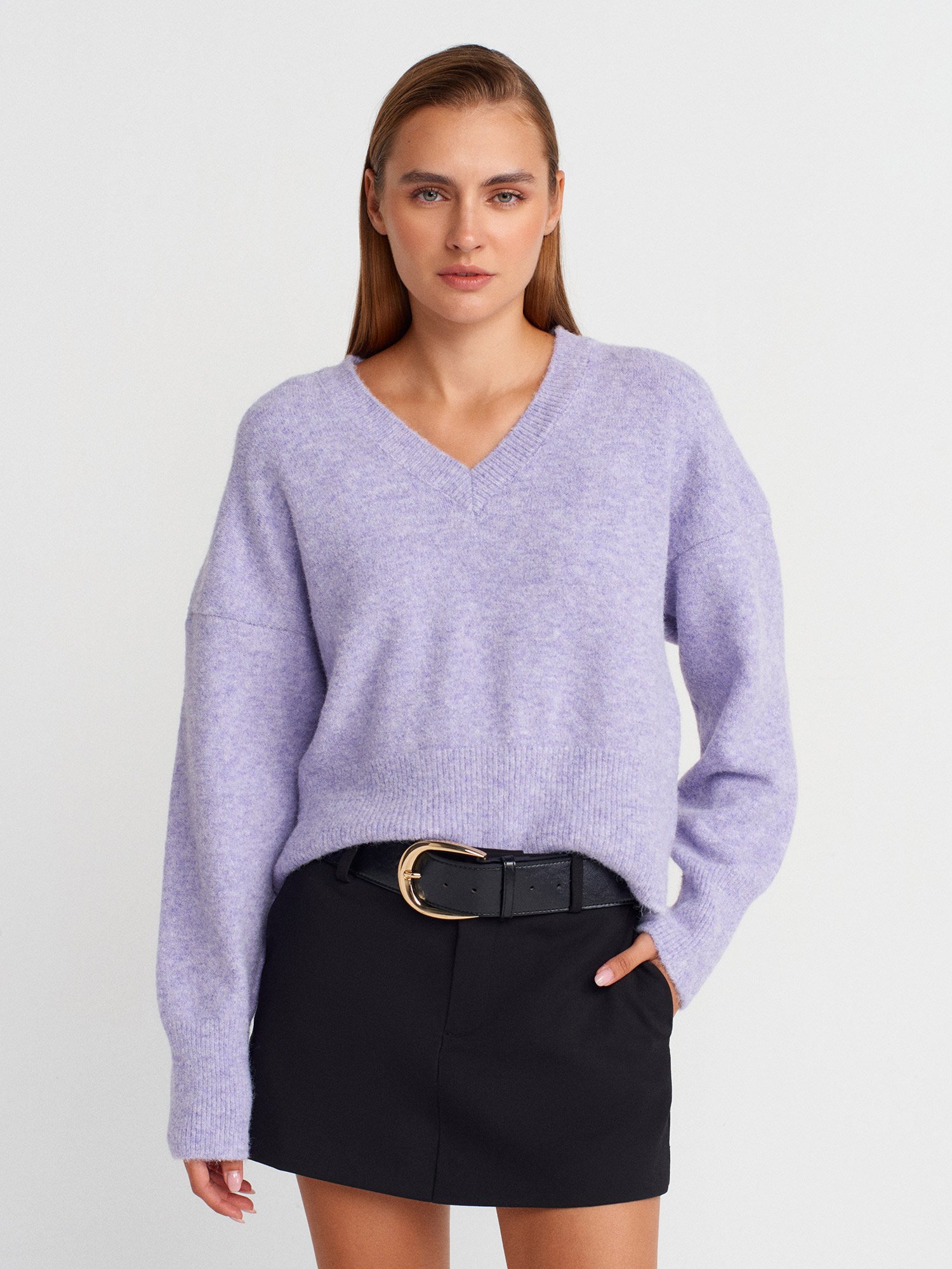 V Yaka Yün Karışımlı Triko Kazak-Lila